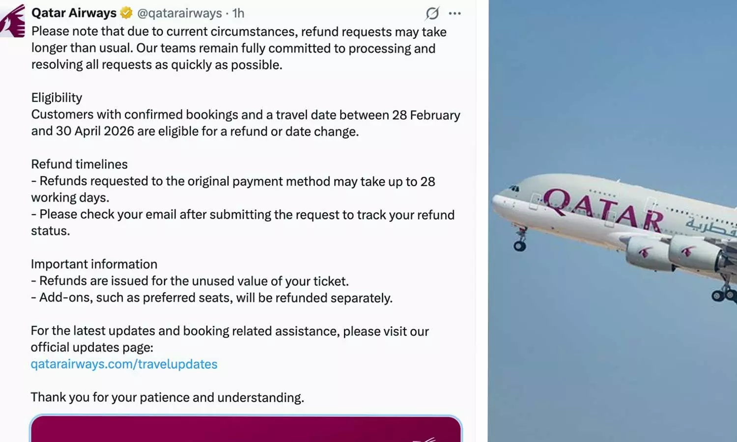 ടിക്കറ്റ് റീഫണ്ടിന് സമയമെടുക്കുമെന്ന് ഖത്തർ എയർവേയ്സ്