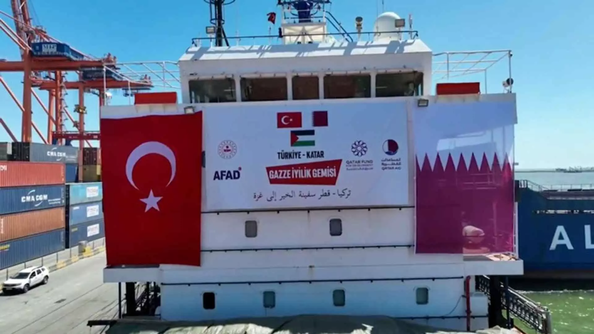 ഖത്തർ ഡെവലപ്മെന്റ് ഫണ്ടിന്റെ 1358 ടൺ സഹായവും തുർക്കിയുടെ ഡിസാസ്റ്റർ ആൻഡ് എമർജൻസി മാനേജ്മെന്റ് പ്രസിഡൻസിയുടെ 550 ടൺ സഹായ സാമഗ്രികളും കപ്പലിലുണ്ട്. മെർസിൻ തുറമുഖത്ത് നിന്നും കപ്പൽ പുറപ്പെടുന്ന ചടങ്ങിൽ ഖത്തർ അന്താരാഷ്ട്ര സഹകരണ സഹമന്ത്രി ലുൽവ ബിൻത് റാഷിദ് അൽ ഖാതിർ പങ്കെടുത്തു.