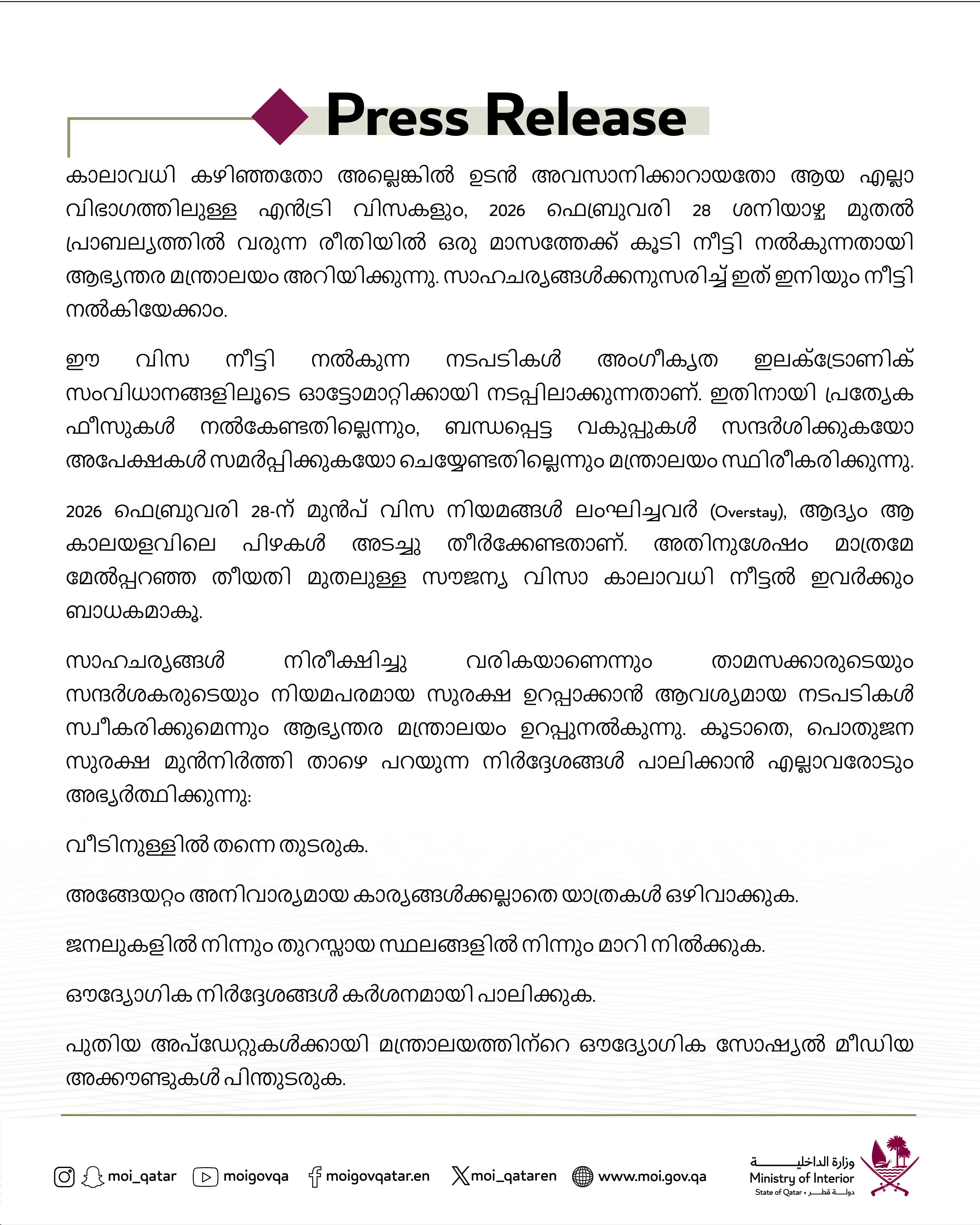 വിസ നീട്ടി നൽകുന്ന നടപടികൾ അംഗീകൃത ഇലക്ട്രോണിക് സംവിധാനങ്ങളിലൂടെ ഓട്ടോമാറ്റിക്കായാണ് നടപ്പാക്കുക. ഇതിനായി പ്രത്യേക ഫീസുകൾ നൽകേണ്ടതില്ലെന്നും ബന്ധപ്പെട്ട വകുപ്പുകൾ സന്ദർശിക്കുകയോ അപേക്ഷകൾ സമർപ്പിക്കുകയോ ചെയ്യേണ്ടതില്ലെന്നും മന്ത്രാലയം വ്യക്തമാക്കി.
