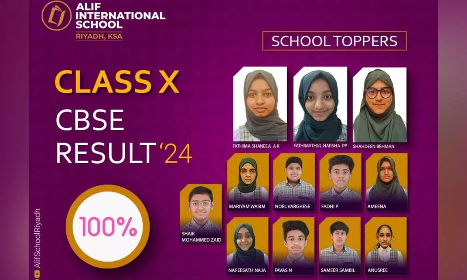 റിയാദ്: സി.ബി.എസ്.ഇ പത്താം ക്ലാസ് പരീക്ഷയിൽ റിയാദ് അലിഫ് ഇന്റർനാഷണൽ സ്കൂളിന് നൂറുമേനി വിജയം. വിജയികളിൽ ഫാത്തിമ ഷനീഹാ, ഫാത്തിമത്തുൽ ഹർഷ, ഷഹദീൻ റഹ്മാൻ എന്നിവർ ഉയർന്ന മാർക്കോടു കൂടി സ്കൂൾ ടോപ്പേഴ്സ് ആയി. വിജയിച്ച കുട്ടികളിൽ 67 ശതമാനം ഡിസ്റ്റിങ്ഷനും 33 ശതമാനം കുട്ടികൾ ഫസ്റ്റ് ക്ലാസും കരസ്ഥമാക്കി.