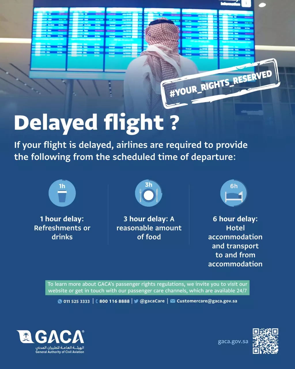 വിമാനം നിശ്ചയിച്ച സമയത്തിൽ നിന്നും വൈകുന്നത് വഴി യാത്രക്കാർക്കുണ്ടാകുന്ന ബുദ്ധിമുട്ടുകൾ ലഘൂകരിക്കുന്നതിന്റെ ഭാഗമായാണ് ബോധവൽക്കരണം. ഇതിനായി യാത്രക്കാർക്ക് സ്വീകരിക്കാവുന്ന നടപടികൾ ഘട്ടം ഘട്ടമായി വിവരിക്കുകയാണ് സൗദി അതോറിറ്റി ഓഫ് സിവിൽ ഏവിയേഷൻ. ടേക്ക് ഓഫ് നേരത്തെ നിശ്ചയിച്ചതിലും ഒരു മണിക്കൂറിലധികം വൈകിയാൽ യാത്രക്കാർക്ക് പാനിയങ്ങളും റീഫ്രഷ്മെന്റുകളും വിമാന കമ്പനി അതികൃതരോട് ആവശ്യപ്പെടാമെന്ന് ഗാക്ക അറിയിച്ചു.