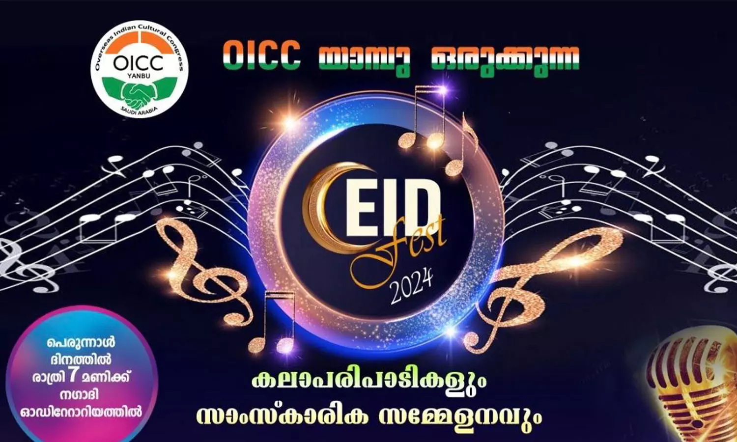 യാമ്പു ഒ.ഐ.സി.സി സംഘടിപ്പിക്കുന്ന പെരുന്നാൾ പ്രോഗ്രാം ''ഈദ് ഫെസ്റ്റ് 2024'' ഒന്നാം പെരുന്നാൾ ദിനത്തിൽ (ഏപ്രിൽ 10, ബുധൻ) വൈകിട്ട് 8മണിക്ക് നഗാദി ഓഡിറ്റോറിയത്തിൽ നടക്കും.