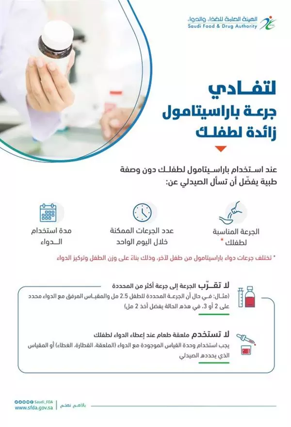 കുട്ടികള്ക്ക് പാരസെറ്റമോള് നല്കുന്നതിനുമുമ്പ് ആരോഗ്യവിദഗ്ധരുടെ ഉപദേശം തേടണമെന്ന് സൗദി ഫുഡ്-ഡ്രഗ് അഡ്മിനിസ്ട്രേഷന്റെ മുന്നറിയിപ്പ്