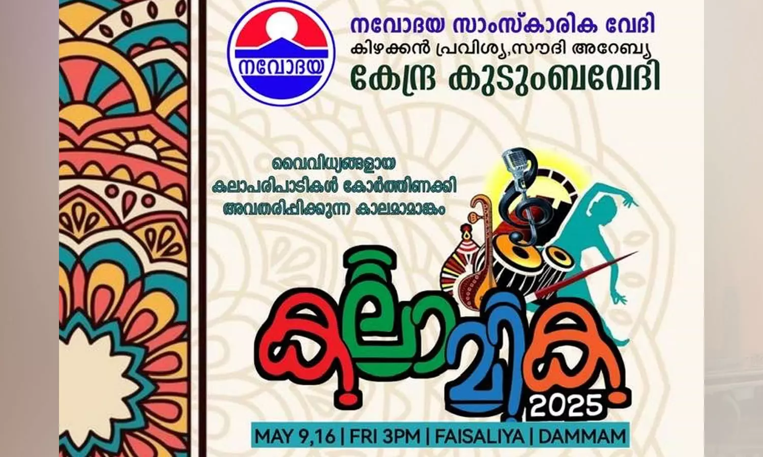 ദമ്മാം: നവോദയ സാംസ്കാരിക വേദി, കിഴക്കൻ പ്രവിശ്യ കേന്ദ്രകുടുംബവേദിയുടെ നേതൃത്വത്തിൽ കലാമിക 2025 എന്ന പേരിൽ കലാപരിപാടി സംഘടിപ്പിക്കുന്നു. മെയ് 9ന് ദമ്മാം ഫൈസലിയയിൽ വെച്ചാണ് പരിപാടി. കേരളത്തിന്റെയും മറ്റു ഇതര സംസ്ഥാനങ്ങളുടെയും കലാസാംസ്കാരിക പൈതൃകം വിളിച്ചറിയിക്കുന്ന വർണ്ണാഭമായ പരിപാടികളാണ് അരങ്ങേറുകയെന്ന് സംഘാടകർ അറിയിച്ചു. നവോദയ കുടുംബവേദിക്ക് കീഴിലുള്ള 22 യൂണിറ്റുകളിൽ നിന്നുള്ള 450 ഓളം കലാകാരന്മാർ പരിപാടിയിൽ അണിനിരക്കും. സംഗീതശില്പം, സ്കിറ്റുകൾ, ഒപ്പന, തിരുവാതിര, മാർഗ്ഗംകളി എന്നിവയും പരിപാടിയുടെ ഭാഗമാകും.