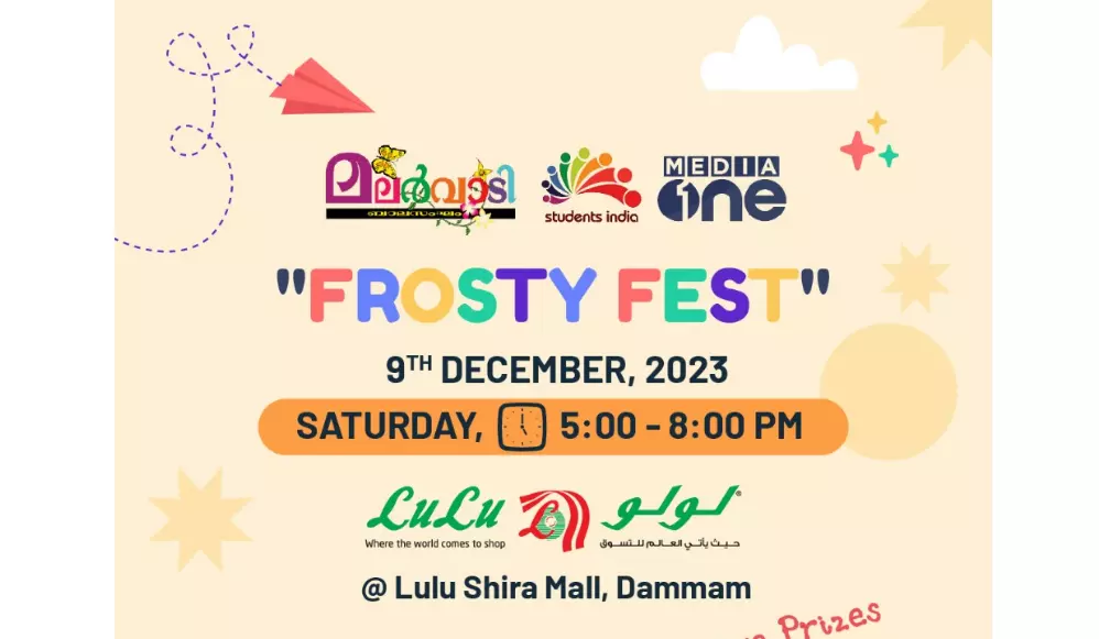 |ദമ്മാം: മലർവാടിയും സ്റ്റുഡന്റ്സ് ഇന്ത്യയും സംയുക്തമായി സംഘടിപ്പിക്കുന്ന 'ഫ്രോസ്റ്റി ഫെസ്റ്റ്' ശനിയാഴ്ച വൈകുന്നേരം 5 മണിക്ക് ദമ്മാം ലുലു മാളിൽ (ശിറാ മാൾ) അരങ്ങേറുമെന്ന് ഭാരവാഹികൾ അറിയിച്ചു.