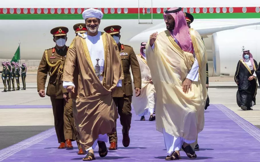 ഇന്ന് ഉച്ചയ്ക്കുശേഷമാണ് ഒമാൻ ഭരണാധികാരി സൗദിയിലെ നിയോം വിമാനത്താവളത്തിൽ എത്തിയത്. സൗദി കിരീടാവകാശി മുഹമ്മദ് ബിൻ സൽമാൻ നേരിട്ടെത്തി സ്വീകരിച്ചു. ഇതിനു പിന്നാലെ ആകാശത്ത് സൗദി, ഒമാൻ പതാകയുടെ നിറത്തിലുള്ള വിമാനങ്ങളെത്തി. വിവിധ തലങ്ങളിലുള്ള ചർച്ചകൾക്കായി എത്തിയ ഒമാൻ ഭരണാധികാരി ഹൈതം ബിൻ ത്വാരിഖിനെ നിയോമിലെ കൊട്ടാരത്തിൽ സൽമാൻ രാജാവാണ് സ്വീകരിച്ചത്.