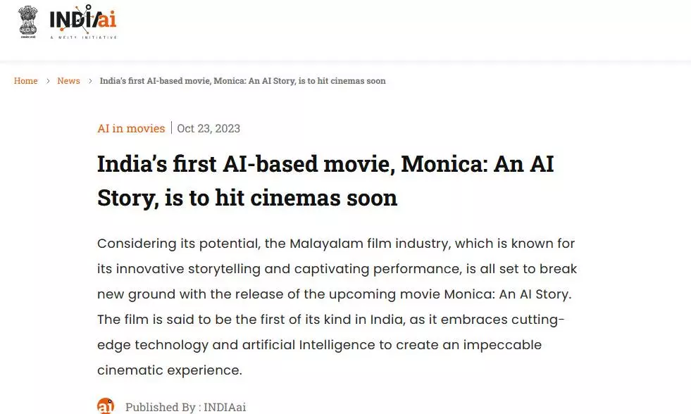 |ഉടൻ പുറത്തിറങ്ങാനിരിക്കുന്ന ആർട്ടിഫിഷ്യൽ ഇന്റലിജൻസ് പ്രമേയമാക്കിയ ഇന്ത്യയിലെ ആദ്യചിത്രം 'മോണിക്ക, ഒരു എഐ സ്റ്റോറി' എന്ന മലയാള ചിത്രം ശ്രദ്ധ നേടുന്നു. ഇന്ത്യയിലെ എഐ പ്രോജക്റ്റുകളെക്കുറിച്ചുള്ള വാർത്തകൾ, ഇവന്റുകൾ എന്നിവ ലഭ്യമാകുന്ന ഇന്ത്യ എഐ വെബ്സൈറ്റിൽ ചിത്രത്തെ കുറിച്ച് രേഖപ്പെടുത്തിയതോടെയാണ് ചിത്രം ശ്രദ്ധിക്കപ്പെടുന്നത്.