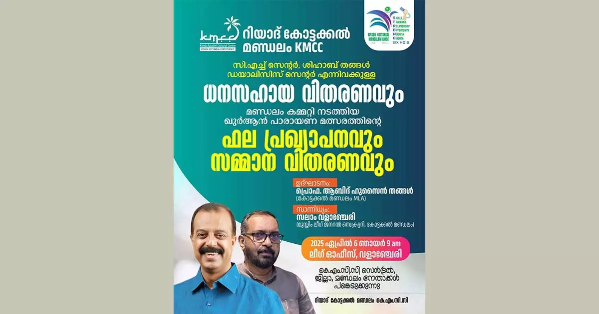 |റിയാദ്: റിയാദ് - കോട്ടക്കൽ മണ്ഡലം കെഎംസിസിയുടെ കോട്ടക്കൽ മണ്ഡലത്തിലെ സി. എച്ച് സെന്റർ , ശിഹാബ് തങ്ങൾ ഡയാലിസിസ് സെന്റർ എന്നിവക്കുള്ള ധന സഹായ വിതരണം ഏപ്രിൽ 6 ഞായറാഴ്ച സംഘടിപ്പിക്കും. രാവിലെ 9 മണിക്ക് വളാഞ്ചേരി മുസ്ലിം ലീഗ് ഓഫീസിൽ വെച്ച് നടക്കുന്ന ചടങ്ങിൽ പ്രൊഫ . ആബിദ് ഹുസൈൻ തങ്ങൾ എംഎൽഎ ധന സഹായം വിതരണം ചെയ്യും. ഇതോടൊപ്പം റംസാനിൽ കോട്ടക്കൽ മണ്ഡലത്തിലെ വിദ്യാർത്ഥി - വിദ്യാർത്ഥിനികൾക്കായി നടത്തിയ ഖുർആൻ പാരായണ മത്സര ഫല പ്രഖ്യാപനവും സമ്മാന വിതരണവും എംഎൽഎ നിർവഹിക്കും. കോട്ടക്കൽ മണ്ഡലം മുസ്ലിം ലീഗ് ഭാരവാഹികളും നാട്ടിലുള്ള കെഎംസിസി ഭാരവാഹികളും പരിപാടിയിൽ പങ്കെടുക്കും.