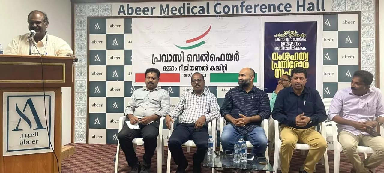 |മണിപ്പൂരിലും ഹരിയാനയിലെ നൂഹിലും സമീപ പ്രദേശങ്ങളിലും ക്രിസ്ത്യൻ-മുസ്ലിം വിഭാഗകങ്ങൾക്കെതിരെ നടന്നുകൊണ്ടിരിക്കുന്ന ആക്രമണങ്ങൾ യാദൃശ്ചികമല്ലെന്നും സംഘ്പരിവാറിന്റെ ആസൂത്രിത ഗൂഢാലോചനയുടെ ഭാഗമാണെന്നും പ്രവാസി വെൽഫെയർ ദമ്മാം റീജീയണൽ കമ്മിറ്റി സംഘടിപ്പിച്ച വംശഹത്യ പ്രതിരോധ സംഗമം അഭിപ്രായപ്പെട്ടു.