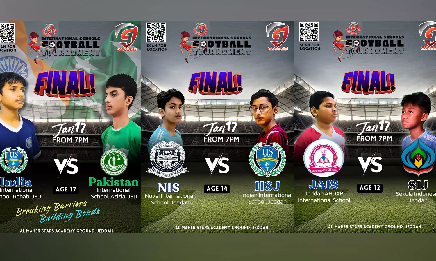 അണ്ടർ12 കുട്ടികളുടെ ഫൈനലിൽ ആഹ്ദാബ് ഇന്റർനാഷണൽ സ്കൂളും ഇൻഡോനേഷ്യൻ ഇന്റർനാഷണൽ സ്കൂളും തമ്മിലാണ് കളി. ആവേശകരമായ സെമിഫൈനലിൽ ഇൻഡോനേഷ്യൻ ഇന്റർനാഷണൽ സ്കൂൾ ജിദ്ദ ഇൻഡോനേഷ്യൻ ഇന്റർനാഷണൽ സ്കൂൾ മക്കയെയും (3-2), ആഹ്ദാബ് ഇന്റർനാഷണൽ സ്കൂൾ ഇന്ത്യൻ ഇന്റർനാഷണൽ സ്കൂളിനെയും പെനാൽറ്റി ഷൂടൗട്ടിൽ (5-4) പരാജയപ്പെടുത്തി. ഇന്ത്യ ഇന്റർനാഷണൽ സ്കൂളും പാക്കിസ്ഥാൻ ഇന്റർനാഷണൽ സ്കൂളും തമ്മിലുള്ള ഫുട്ബോൾ മത്സരം കാണാൻ എല്ലാവരെയും ക്ഷണിക്കുന്നതായി ഗൂഗിളിസ് സ്പോർട്സ് ക്ലബ് ഭാരവാഹികൾ അറിയിച്ചു.