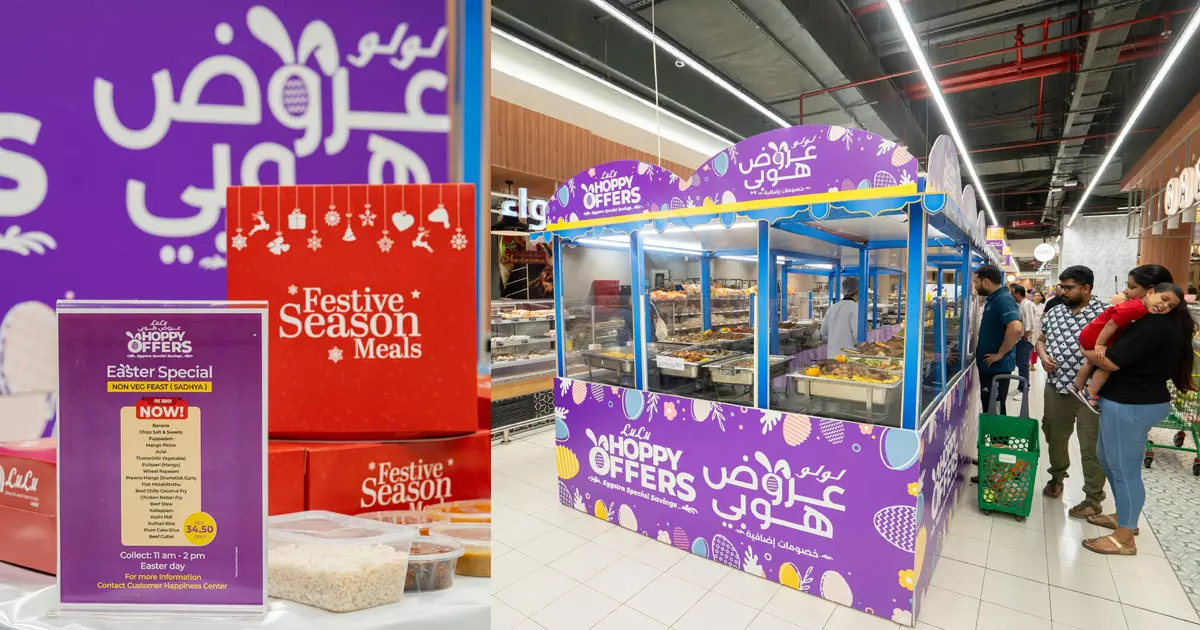 നൊസ്റ്റാൾജിക് ഓർമ്മകളിലേക്ക് കൂടി കൊണ്ടുപോകുന്ന അച്ചായൻസ് സദ്യ ഏവരുടെയും മനം കവരുന്നതാണ്. പ്രോൺസ് മാംഗോ ഡ്രംസ്റ്റിക് കറി, മീൻ മുളകിട്ടത്, ബീഫ് ചില്ലി കൊക്കനട്ട് ഫ്രൈ, ചിക്കൻ നാടൻ ഫ്രൈ, ബീഫ് സ്റ്റു, അപ്പം, കോഴിപ്പിടി, കുത്തരിചോറ്, അവിയൽ, തോരൻ, പുളിശേരി, പായസം അടക്കം 18 ലേറെ വിഭവങ്ങൾ അടങ്ങിയതാണ് ലുലു അച്ചായൻസ് സദ്യ. 34.50 ദിർഹം മാത്രമാണ് വില. ഈസ്റ്ററിനോട് അനുബന്ധിച്ച് വീട്ടുപകരണങ്ങൾ, ഇലക്ട്രോണിക്സ് ഉത്പന്നങ്ങൾക്കും മികച്ച ഓഫറുകളാണ് ഒരുക്കിയിട്ടുള്ളത്.