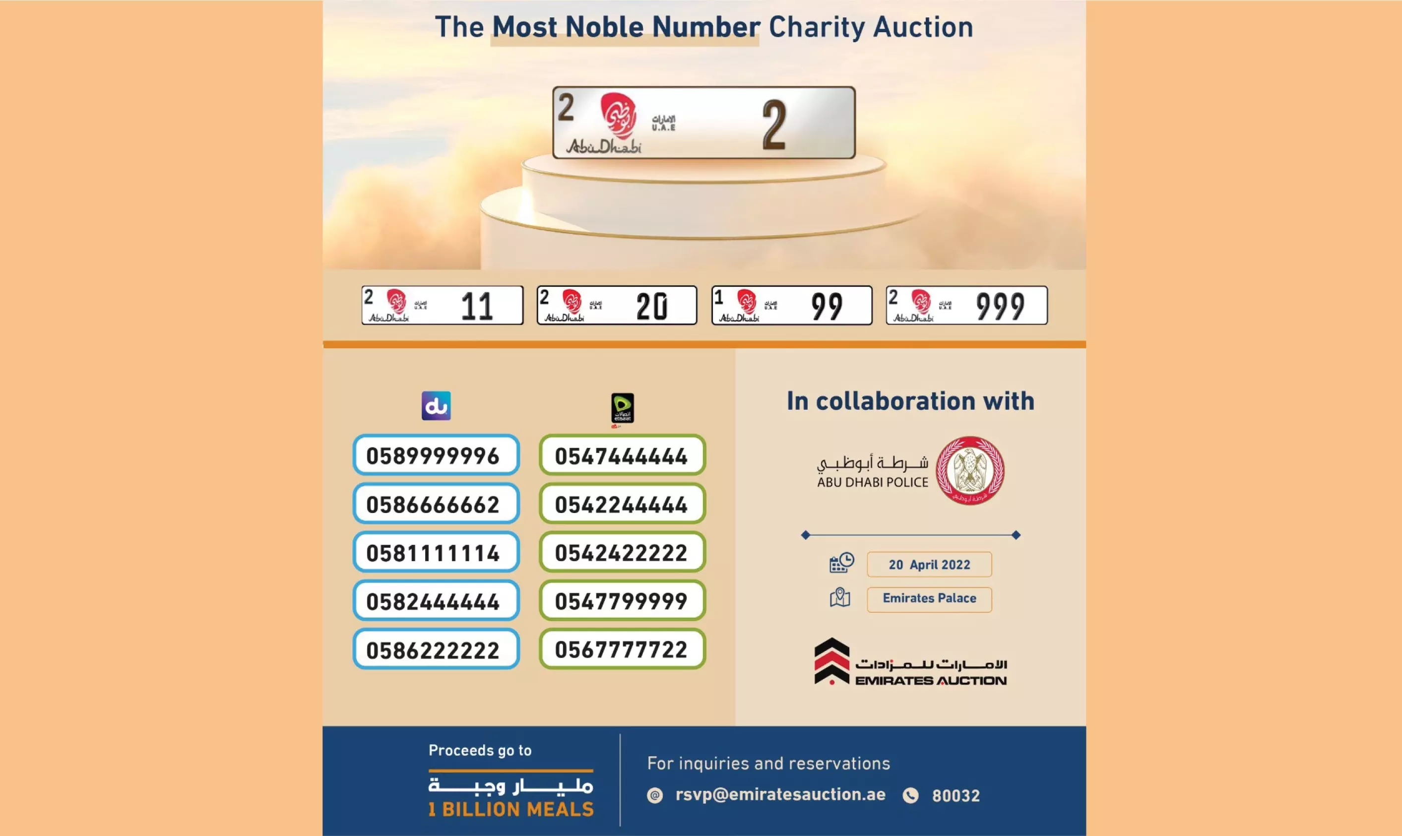 അബൂദബിയിലെ രണ്ട്, പതിനൊന്ന്, ഇരുപത്തി രണ്ട്, തൊള്ളായിരത്തി തൊണ്ണൂറ്റി ഒന്പത് തുടങ്ങിയ നമ്പര് പ്ലേറ്റുകളും, അത്യപൂര്വ മൊബൈല് നമ്പറുകളമാണ് ലേലത്തില് വയ്ക്കുക. ലേലത്തില് ലഭിക്കുന്ന തുക വണ് ബില്യണ് മീല്സ് പദ്ധതിക്കായി ഉപയോഗിക്കും.