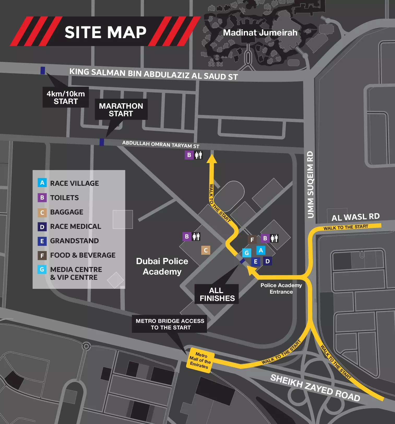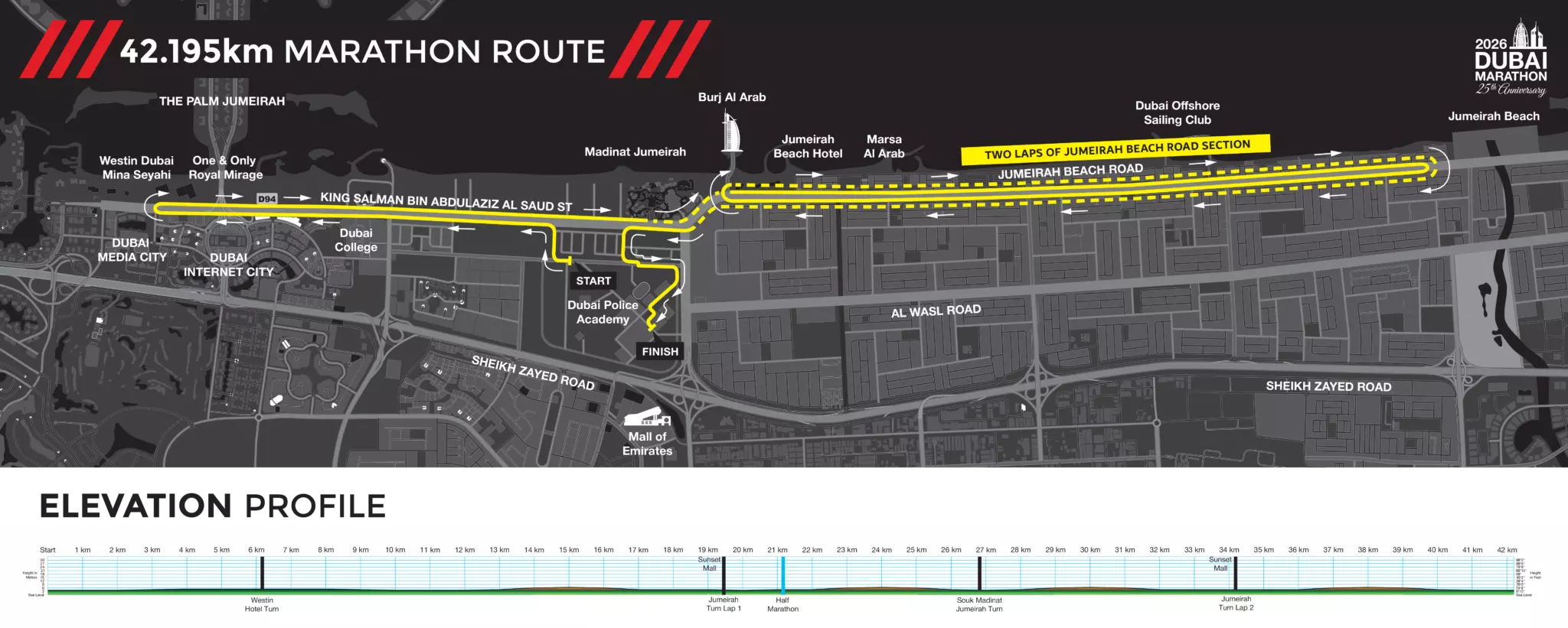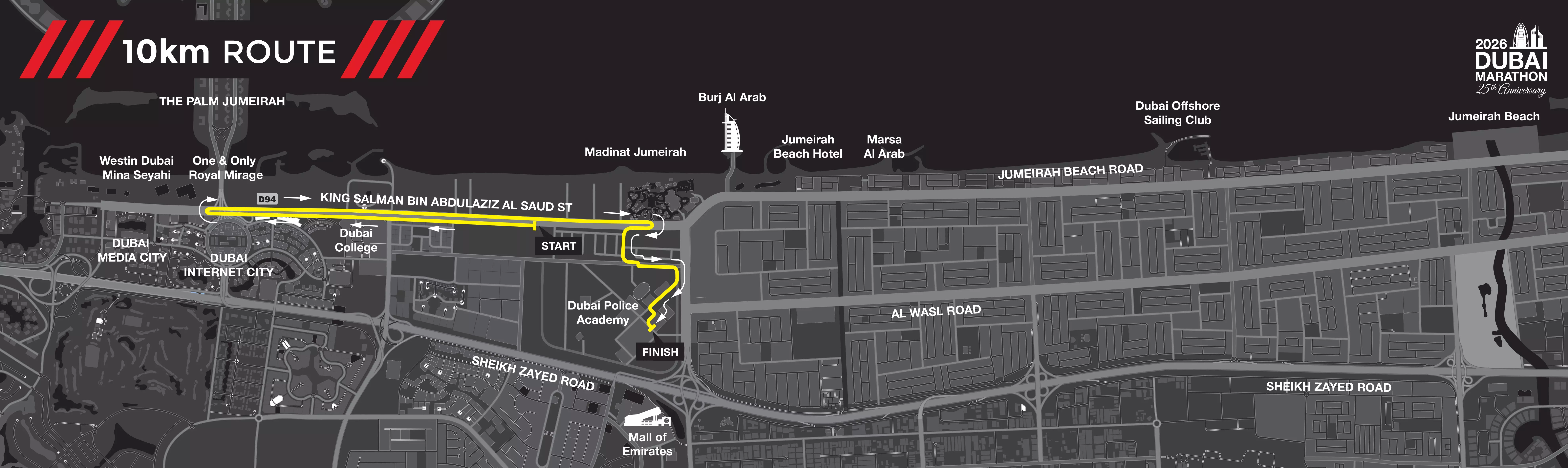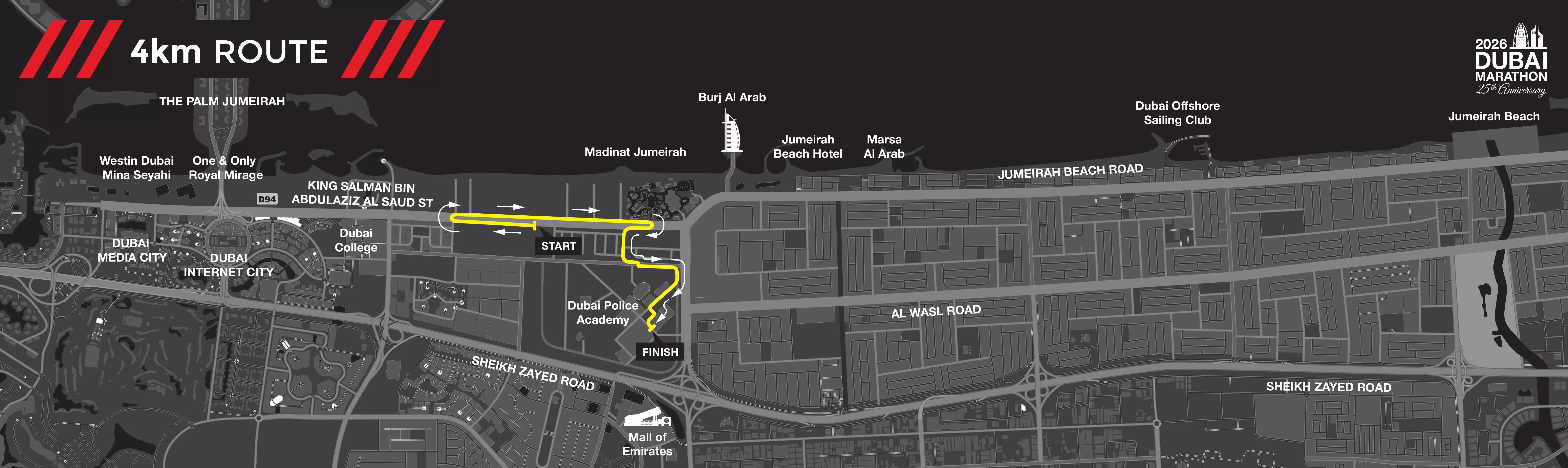 അൽ തരീം റോഡിലാണ് മാരത്തണിന്റെ തുടക്കം. മദീനത്ത് ജുമൈറയ്ക്ക് ശേഷമുള്ള അൽ സുഫൂഹിൽ വെച്ച് 10 കിലോമീറ്റർ- നാല് കിലോമീറ്റർ റേസുകൾ ആരംഭിക്കും. എല്ലാ റേസുകളും അവസാനിക്കുക ഉമ്മു സുഖീം റോഡിന് സമീപമുള്ള ദുബൈ പൊലീസ് അക്കാദമിയിലായിരിക്കും.