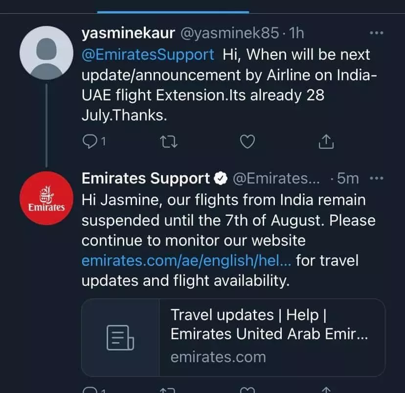 ഇന്ത്യയില് നിന്നുള്ള യാത്രാവിലക്ക് ആഗസ്ത് 2 വരെ നീട്ടിയെന്ന് നേരത്തെ ഇത്തിഹാദ് എയർലൈൻസ് അറിയിച്ചിരുന്നു. വിലക്ക് ഇനിയും നീട്ടിയേക്കുമെന്നും അധികൃതർ അറിയിക്കുകയുണ്ടായി.