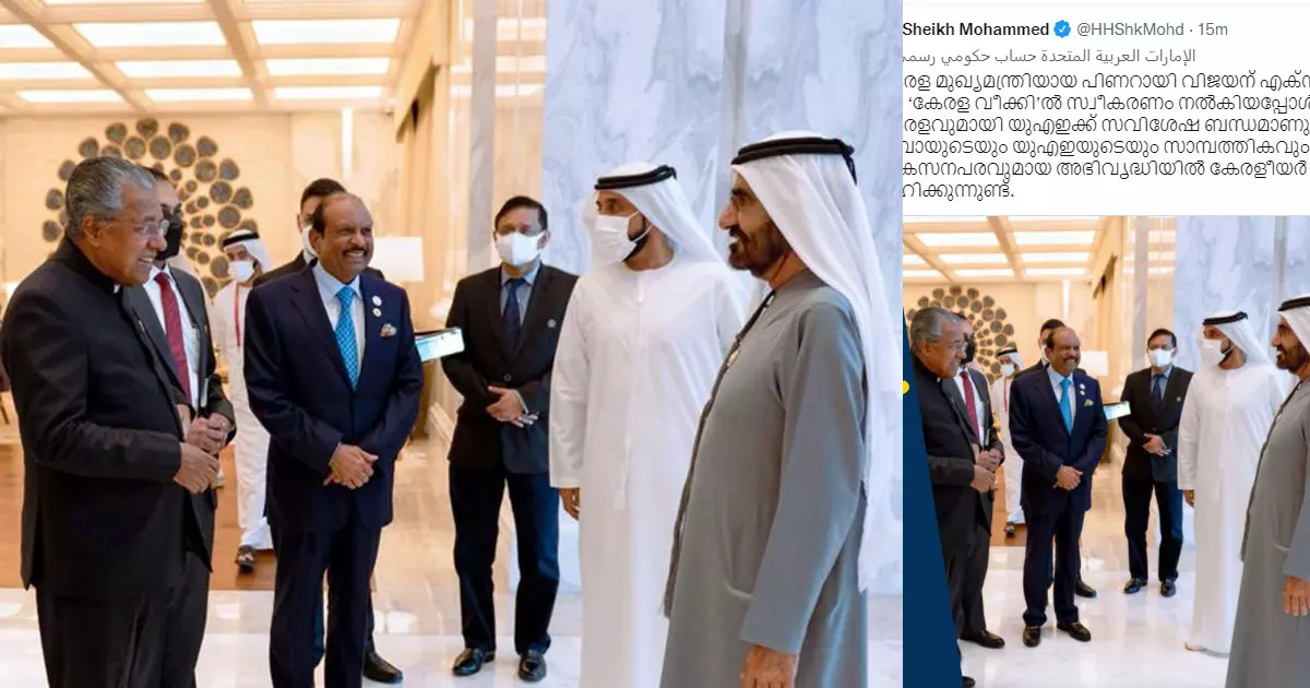 ദുബൈ സന്ദർശനത്തിനെത്തിയ കേരള മുഖ്യമന്ത്രി പിണറായി വിജയന് നൽകിയ സ്വീകരണ ചിത്രവുമായി മലയാളത്തിൽ ട്വീറ്റ് ചെയ്ത് ദുബൈ ഭരണാധികാരി ശൈഖ് മുഹമ്മദ് ബിൻ റാശിദ് ആൽ മക്തൂം. ദുബൈ എക്സ്പോ 2020ലെ കേരള വീക്കിൽ പിണറായി വിജയനുമായുള്ള കൂടിക്കാഴ്ച്ച സംബന്ധിച്ചാണ് യു എ ഇ വൈസ് പ്രസിഡന്റും പ്രധാനമന്ത്രിയും കൂടിയായ ശൈഖ് മുഹമ്മദ് ട്വീറ്റ് ചെയ്തത്. 'കേരളവുമായി യുഎഇക്ക് സവിശേഷ ബന്ധമാണുള്ളത്, ദുബായുടെയും യുഎഇയുടെയും സാമ്പത്തികവും വികസനപരവുമായ അഭിവൃദ്ധിയിൽ കേരളീയർ പ്രധാന പങ്ക് വഹിക്കുന്നുണ്ട്.' അദ്ദേഹം ട്വീറ്റിൽ പറഞ്ഞു.