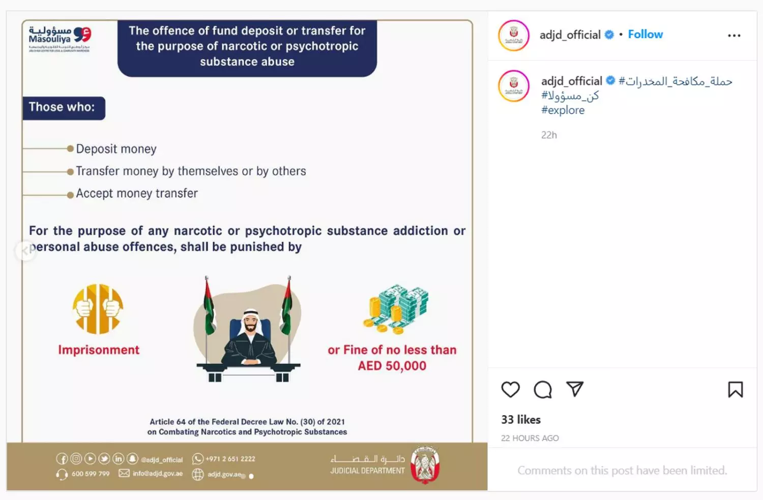 ഇത്തരം ലഹരിവസ്തു ഉപയോഗ നിയന്ത്രണത്തിന്റെ ഭാഗമായി അബുദാബിയിലെ ഷോപ്പിങ് മാളുകളിൽ ബാധവൽക്കരണ ചിത്രങ്ങളും മറ്റും പ്രദർശിപ്പിക്കുന്നുണ്ട്. ഇതടക്കം സമീപകാലത്തായി നിരവധി ലഹരിവിരുദ്ധ ബോധവൽക്കരണ കാമ്പയിനുകൾ വിപുലമായി നടത്തുമെന്ന് അബുദാബി ജുഡീഷ്യൽ ഡിപ്പാർട്ട്മെന്റ് അറിയിച്ചിട്ടുണ്ട്.
