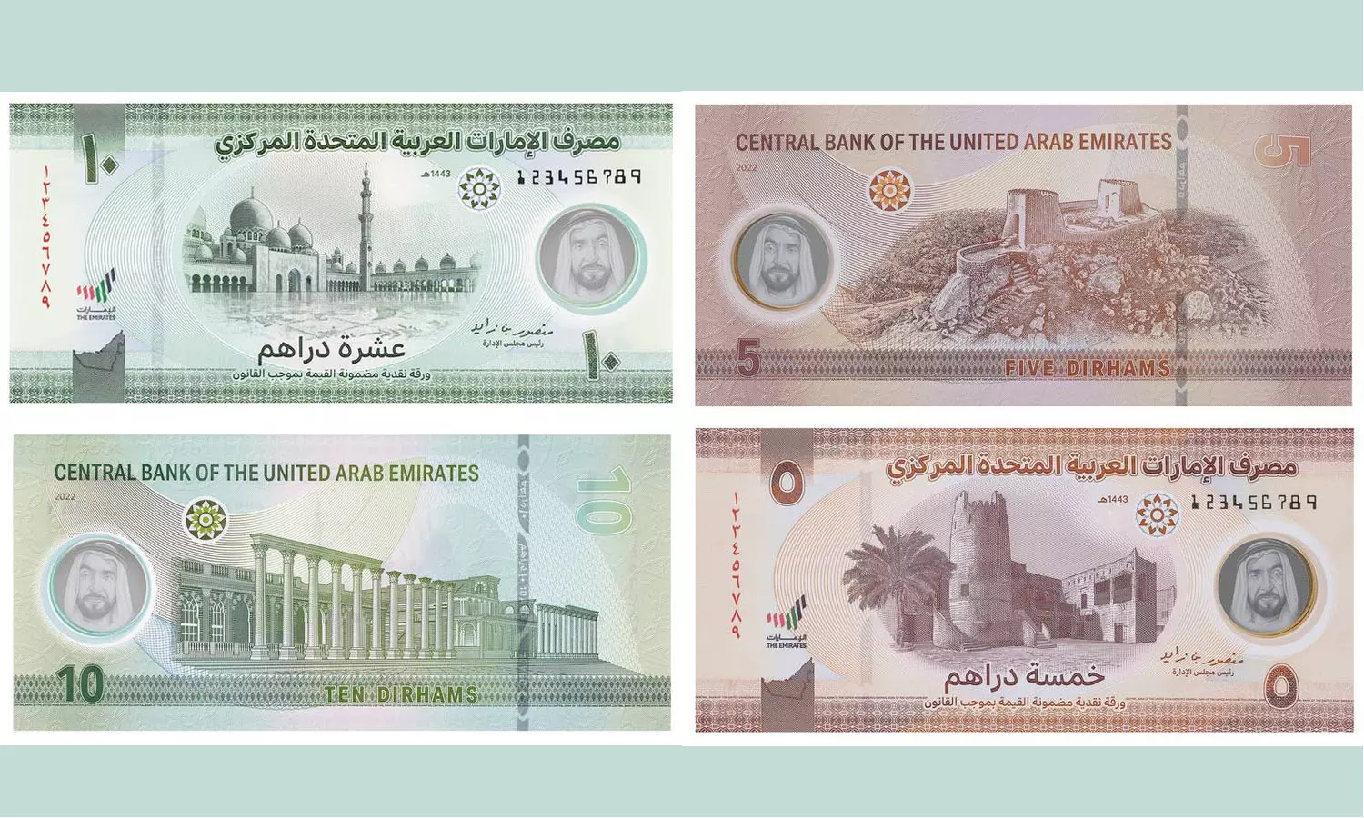 നേരത്തേ സമാനമായ 50 ദിർഹം നോട്ടുകൾ യു.എ.ഇ പുറത്തിറക്കിയിരുന്നു. പുതിയ അഞ്ച് ദിർഹം നോട്ടിൽ രാഷ്ട്രപിതാവ് ശൈഖ് സായിദിന്റെ ചിത്രത്തിന് പുറമെ യു.എ.ഇയുടെ പാരമ്പര്യം വിളിച്ചറിയിക്കുന്ന അജ്മാനിലെയും, റാസൽഖൈമയിലെയും കോട്ടകളുടെ ചിത്രമുണ്ട്. പത്ത് ദിർഹത്തിന്റെ നോട്ടിൽ അബൂദബി ശൈഖ് സായിദ് മസ്ജിദിന്റെയും, ഖൊർഫുക്കാൻ ആംഫി തിയേറ്ററിന്റെയും ചിത്രങ്ങൾ ചേർത്തിട്ടുണ്ട്. അനുകരിക്കാൻ കഴിയാത്ത ഉയർന്ന സുരക്ഷാ സംവിധാനങ്ങളാണ് നോട്ടിലുള്ളതെന്ന് സെൻട്രൽബാങ്ക് വ്യക്തമാക്കി.