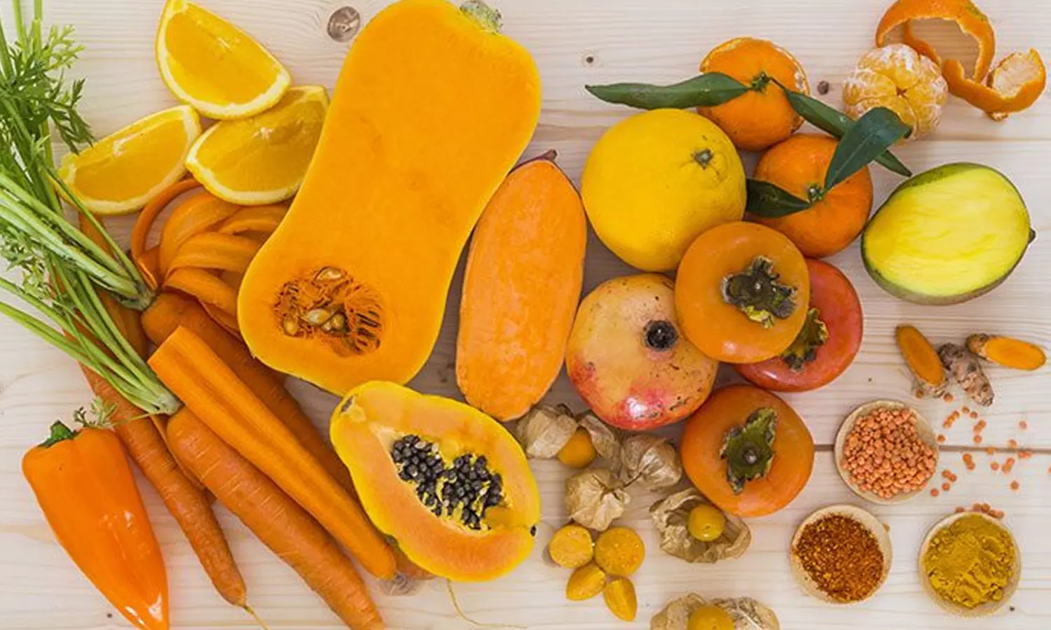 ഓറഞ്ച് / മഞ്ഞ നിറത്തിലുള്ള ഭക്ഷ്യവിഭവങ്ങളില് ബീറ്റക്രിപ്റ്റോക്സാന്തിന്, ബീറ്റ കരോട്ടിന്, ആല്ഫ കരോട്ടിന് എന്നിവ ധാരാളമുണ്ട്. ഇത് കൂടാതെ പൊട്ടാസ്യവും, വൈറ്റമിന് സി, ഫ്ളേവനോയിഡ്സ്, ലൈകോപീന് എന്നിവയും ഇവ പ്രദാനം ചെയ്യുന്നു.