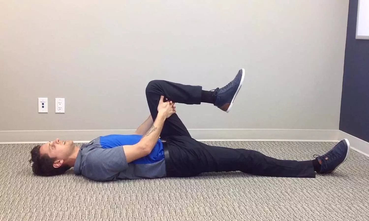 ഈ വ്യായാമത്തിനായി, നിങ്ങളുടെ കാൽമുട്ടുകൾ വളച്ച് നിങ്ങളുടെ പാദങ്ങൾ തറയിൽ ഉറപ്പിച്ചുകൊണ്ട് നടുനിവർത്തി കിടക്കുക. നിങ്ങളുടെ നെഞ്ചിലേക്ക് ഒരു കാൽമുട്ട് ഉയർത്തുക, രണ്ട് കൈകളാലും പിടിക്കുക. 30 സെക്കൻഡ് ഈ സ്ഥാനത്ത് വയ്ക്കുക, തുടർന്ന് മറ്റേ കാൽ ഉപയോഗിച്ചും ഇത് ആവർത്തിക്കുക.