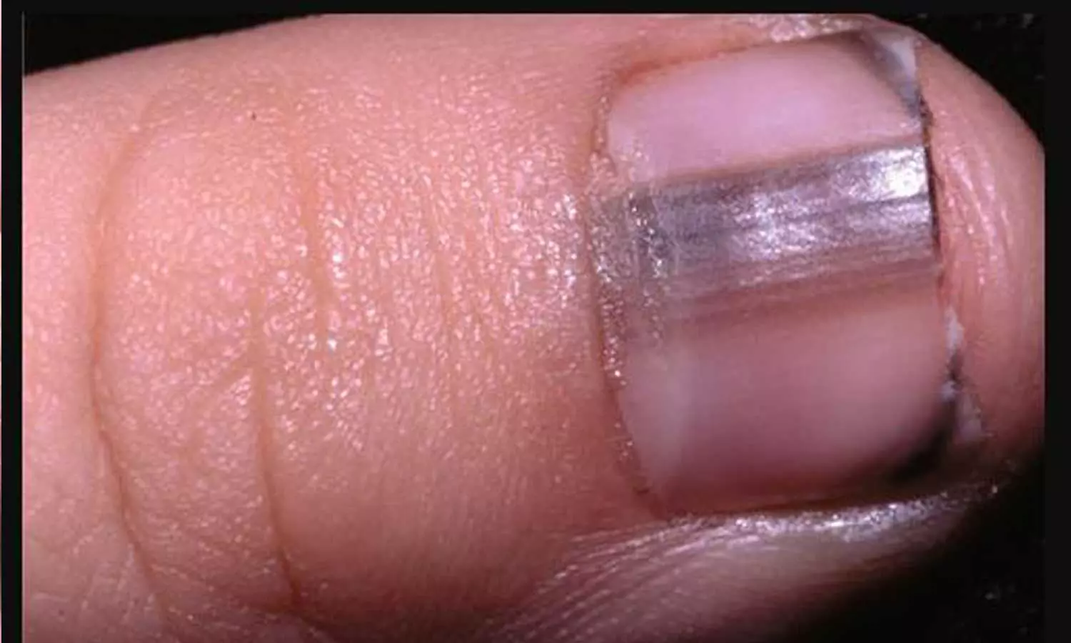 പുറം തൊലി മുതൽ നഖത്തിന്റെ അറ്റം വരെ നീളുന്ന കറുത്ത വരെ ഗുരുതരമായ ത്വക്ക് കാൻസറായ മെലനോമയുടെ സൂചനകളാകാം. നഖങ്ങളില് ക്ഷതമേല്ക്കുമ്പോഴും ഇത്തരത്തില് കറുത്ത വരകള് ഉണ്ടായേക്കാം. എന്നാല് അങ്ങനെയല്ലാതെ നഖങ്ങളിൽ ഇത്തരത്തിൽ കറുത്ത വരകൾ തെളിഞ്ഞുകാണുന്നുണ്ടെങ്കിൽ ത്വക്ക് രോഗ വിദഗ്ധനെ കണ്ട് ചികിത്സ തേടണം. ഒരു വിരലിൽ തന്നെ ഇത്തരം വരകൾ എപ്പോഴും കാണുകയാണെങ്കിലും ശ്രദ്ധിക്കണം.