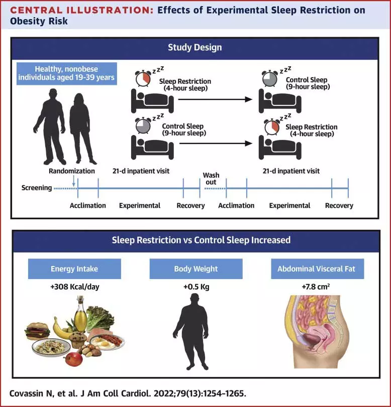 പരീക്ഷണ ഘട്ടത്തിൽ ഇവർക്ക് ഇഷ്ടമുള്ള രീതിയിൽ ഭക്ഷണം കഴിക്കാനുള്ള സ്വാതന്ത്ര്യം നൽകിയിരുന്നു. ഉറക്കം കുറവുള്ളവർ ഓരോ ദിവസവും, ഉറങ്ങുന്നവരേക്കാൾ 300 കലോറി വീതം അധികമാണ് ഭക്ഷിച്ചത്. ഉറക്കം കുറവുള്ളവരിൽ 9 ശതമാനം വരെ ബെല്ലി ഫാറ്റും 11 ശതമാനം വരെ വിസറൽ ഫാറ്റും വർധിച്ചതായി കണ്ടെത്തി. വയറിനകത്തെ അവയവങ്ങളിൽ ആഴത്തിൽ പറ്റിപ്പിടിക്കുകയും അൾഷിമേഴ്സ്, സ്ട്രോക്ക്, ടൈപ്പ് 2 പ്രമേഹം എന്നിവയ്ക്ക് കാരണമാവുകയും ചെയ്യുന്നതാണ് വിസറൽ ഫാറ്റ്.