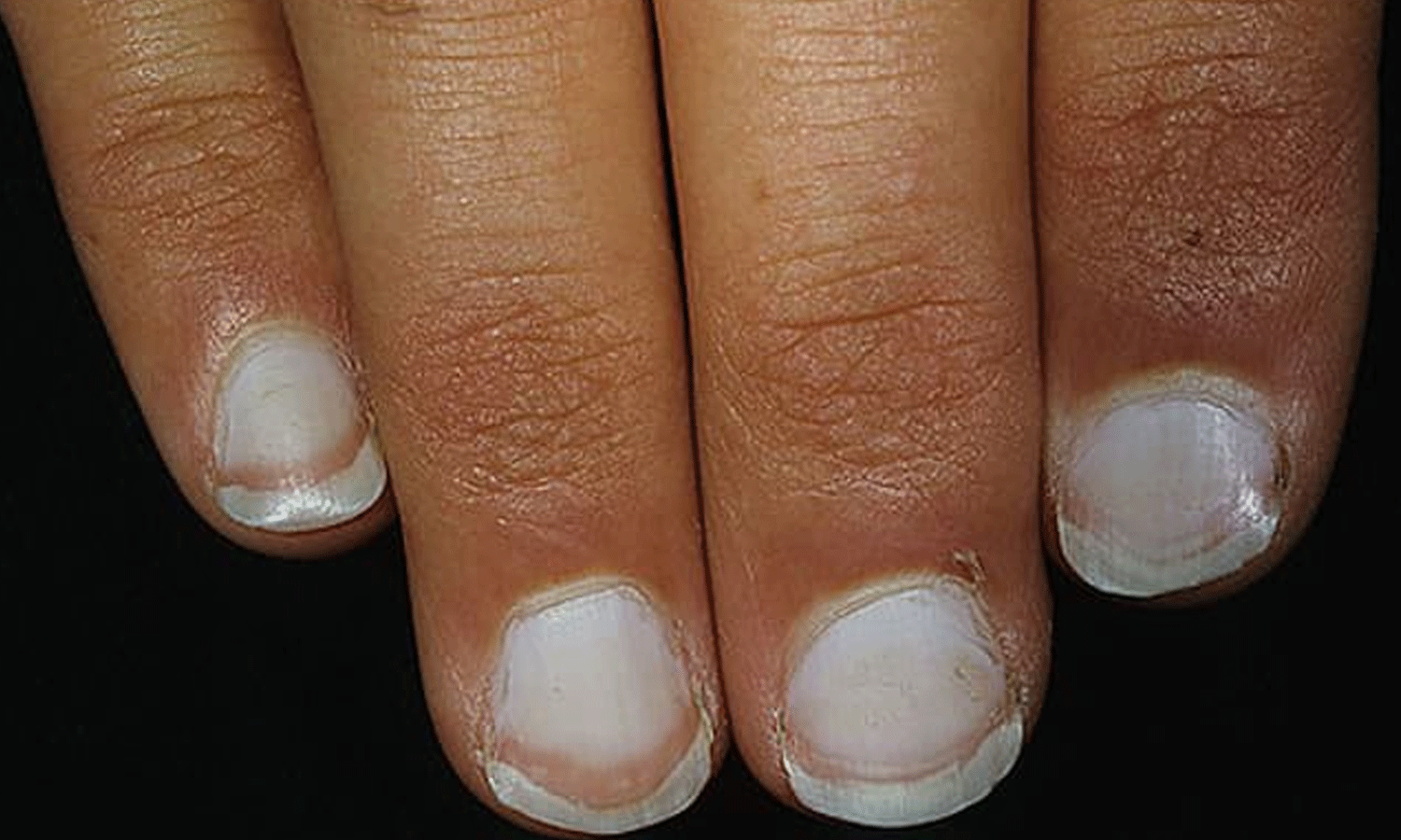 നഖങ്ങളിലെ ഏതെങ്കിലും തരത്തിലുള്ള നിറവ്യത്യാസമോ വിളർച്ചയോ ചില ആരോഗ്യപ്രശ്നങ്ങളുടെ അടയാളമാണ്. ശരീരത്തിലെ വിളർച്ച, ഹൃദ്രോഗം ,വൃക്കരോഗം, തുടങ്ങിയവയിൽ ഏതെങ്കിലും അസുഖമുള്ളയാളുകളുടെ നഖങ്ങളാണ് വിളറിയ രീതിയില് കാണപ്പെടുന്നത്.