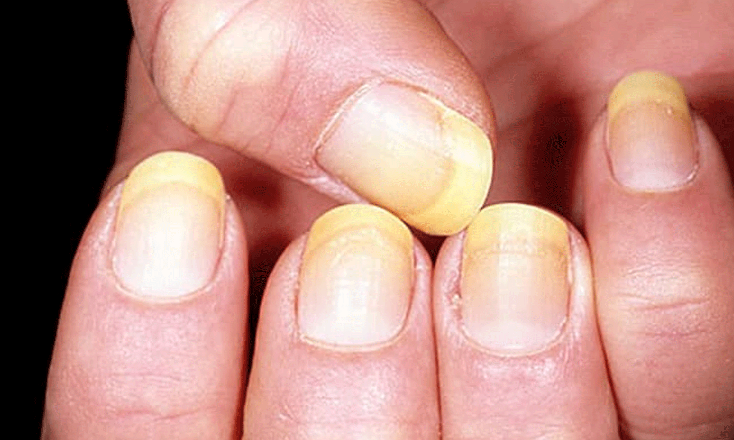 ഇളം മഞ്ഞ നിറമുള്ള നഖങ്ങൾ നിങ്ങളുടെ കരൾ, വൃക്ക അല്ലെങ്കിൽ ഹൃദയം തുടങ്ങിയവയുടെ പ്രശ്നങ്ങളെയാണ് ചൂണ്ടിക്കാട്ടുന്നത്. രക്തക്കുറവ് അഥവാ അനീമിയ, കരൾ പ്രശ്നങ്ങൾ, ഹൃദയസ്തംഭനം, തൈറോയ്ഡ്, ശ്വാസകോശ സംബന്ധമായ രോഗം, പ്രമേഹം, സോറിയാസിസ് തുടങ്ങിയ രോഗസാധ്യതകളേയും കാണിക്കുന്നു.