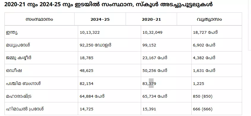 |10 വർഷത്തിൽ ഇന്ത്യയിൽ 93,000ത്തിലധികം സ്കൂളുകൾ അടച്ചുപൂട്ടിയതായി കേന്ദ്ര വിദ്യാഭ്യാസ മന്ത്രാലയം ലോക്സഭയിൽ അവതരിപ്പിച്ച ഔദ്യോഗിക കണക്കുകൾ വ്യക്തമാക്കുന്നു
