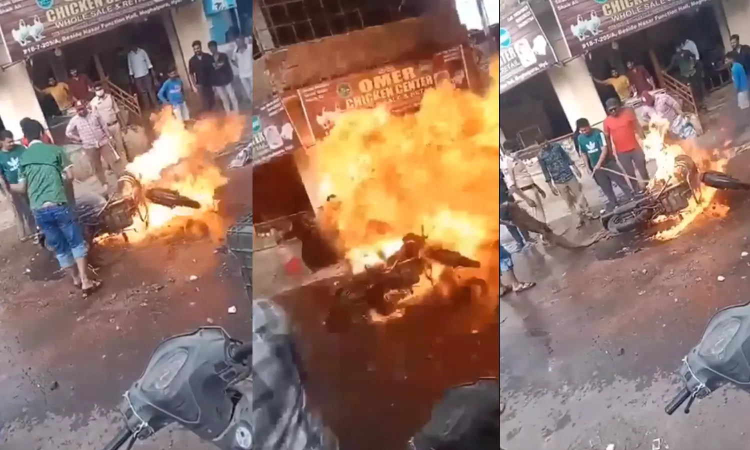 ബൈക്കിലെ തീകെടുത്താൻ ശ്രമിക്കുന്നതിനിടെയാണ് പത്ത് പേർക്കും പൊള്ളലേറ്റതെന്നാണ് വിവരം. പരിക്കേറ്റവരിൽ ഒരു പൊലീസുകാരനുമുണ്ട്. ബിബി ബസാറിൽ എത്തിയ ഉടൻ തന്നെ ബൈക്കിന് തീപിടിക്കുന്നതായാണ് വീഡിയോയിൽ കാണുന്നത്. ബൈക്ക് ഓടിച്ച യുവാവ് ഉടൻ തന്നെ ചാടിയിറങ്ങി.