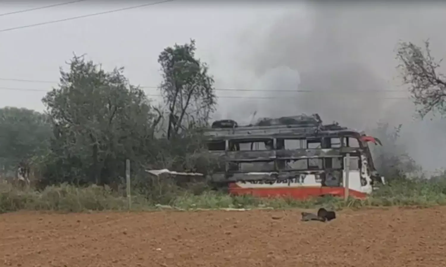ഓടിക്കൊണ്ടിരുന്ന ബസ് ഹൈടെൻഷൻ വൈദ്യുതി ലൈനിൽ തട്ടി തീപിടിച്ചു; രണ്ട് തൊഴിലാളികൾക്ക് ദാരുണാന്ത്യം