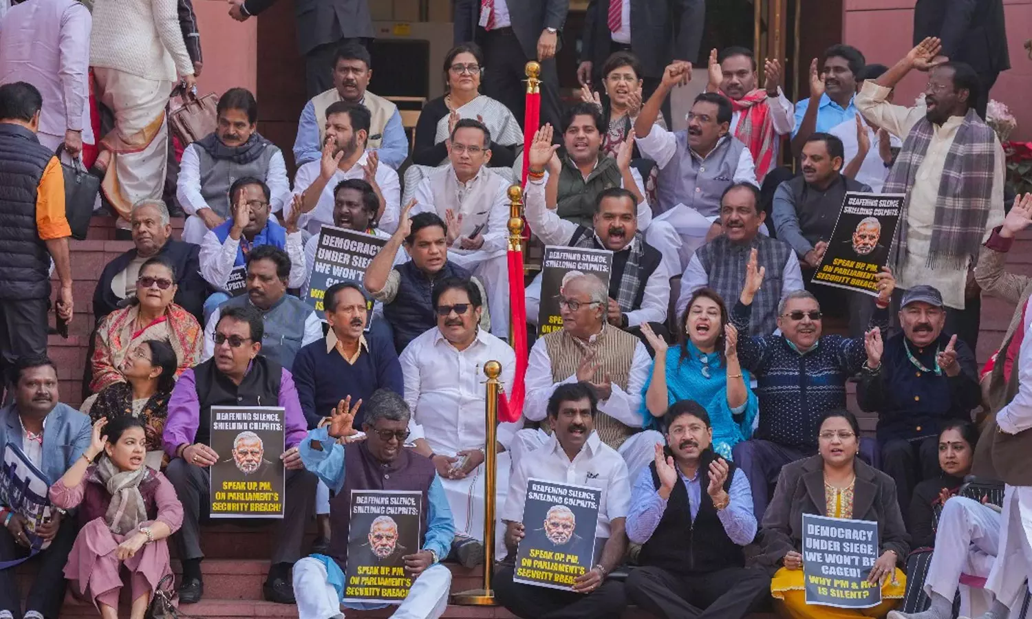 പാർലമെന്റ് അതിക്രമത്തിൽ ആഭ്യന്തരമന്ത്രി അമിത് ഷാ സഭയിൽ പ്രസ്താവന നടത്തണമെന്ന് ആവശ്യപ്പെട്ടാണ് എം.പിമാർ പ്രതിഷേധിച്ചത്. നേരത്തെ മലയാളികളടക്കമുള്ള എം.പിമാരെയാണ് ലോക്സഭയിൽ നിന്നും രാജ്യസഭയിൽ നിന്നും സസ്പെൻഡ് ചെയ്തത്.