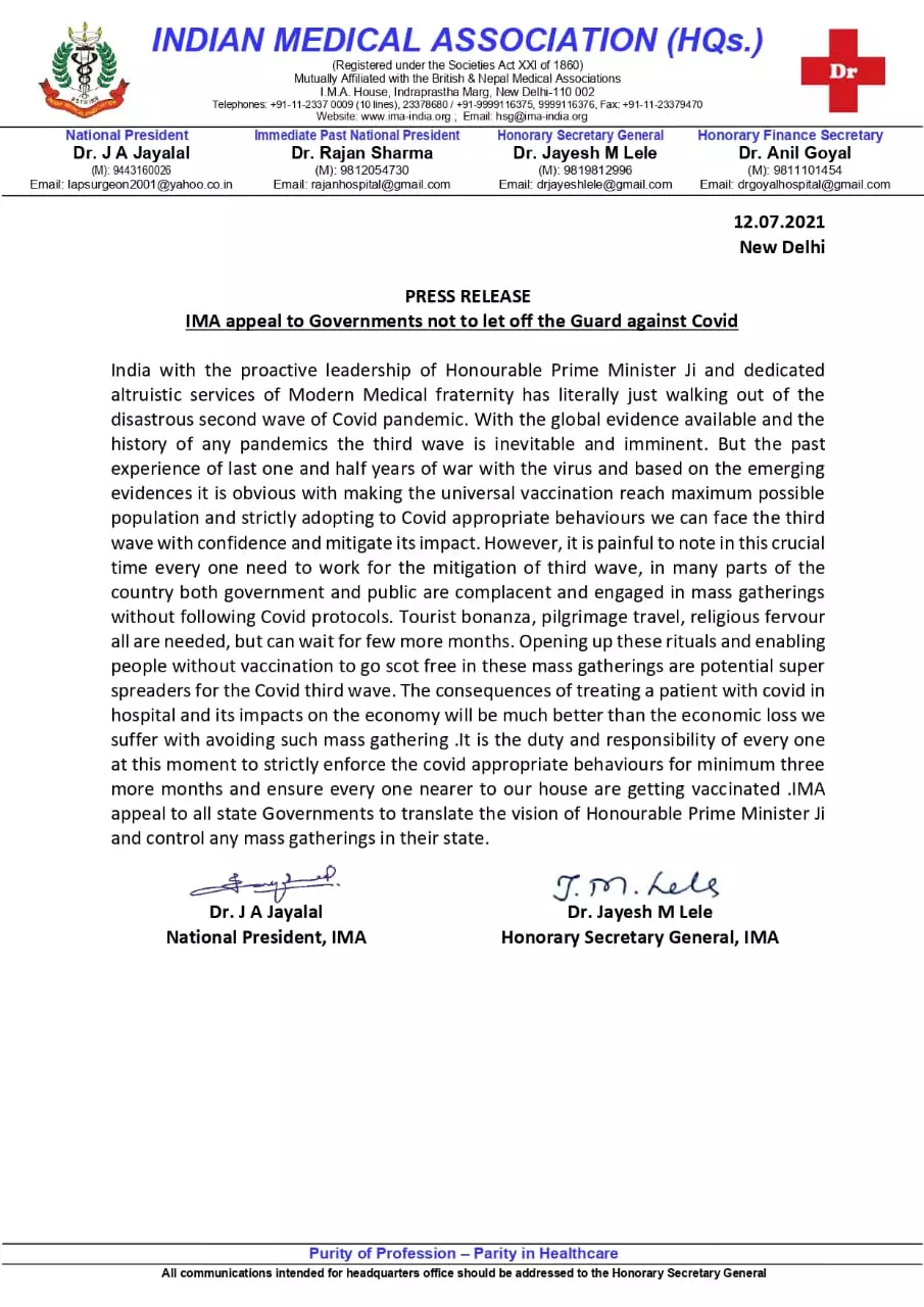 വിനോദ സഞ്ചാരം, തീര്ത്ഥാടന യാത്ര, മതപരമായ ആഘോഷങ്ങള് എന്നിവയെല്ലാം ആവശ്യമാണ്. എന്നാല് ഇവയെല്ലാം അനുവദിക്കാന് കുറച്ചുമാസങ്ങള് കൂടി കാത്തിരിക്കണം. ഇത്തരം ഇടങ്ങളില് വാക്സിന് എടുക്കാതെ ആളുകള് കൂട്ടമായെത്തുന്നത് കോവിഡ് മൂന്നാം തരംഗത്തിന്റെ സൂപ്പര് സ്പ്രെഡിന് ഇടയാക്കുമെന്നും ഐഎംഎ മുന്നറിയിപ്പ് നല്കി.കോവിഡ് രോഗിയെ ചികിത്സിക്കുന്നതിലൂടെ ഉണ്ടാകുന്ന സാമ്പത്തിക പ്രത്യാഘാതങ്ങൾ കൂടിച്ചേരലുകൾ ഒഴിവാക്കിയാൽ ഉണ്ടാകുന്ന സാമ്പത്തിക പ്രതിസന്ധിയേക്കാൾ കൂടുതലാണെന്നും ഐ.എം.എ അഭിപ്രായപ്പെട്ടു.