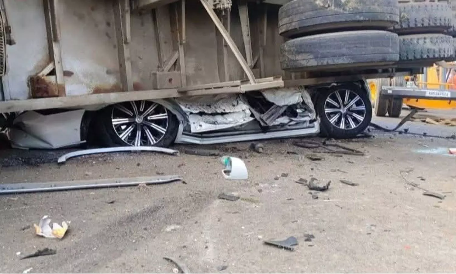 ബെംഗളൂരുവിൽ നിന്ന് തുംകുരുവിലേക്ക് പോവുകയായിരുന്ന എസ്യുവിയും ട്രക്കും വഴിമധ്യേ ആണ് അപകടത്തിൽപെട്ടത്. ഒരേ പാതയിലൂടെയായിരുന്നു രണ്ടുവാഹനങ്ങളും സഞ്ചരിച്ചിരുന്നത്. ഇതിനിടെ എതിരെ വന്ന ലോറിയുമായി കണ്ടെയ്നർ ട്രക്ക് കൂട്ടിയിടിച്ച് കാറിന് മുകളിലേക്ക് മറിയുകയായിരുന്നു. എസ്യുവി പൂർണമായും തകർന്നു.