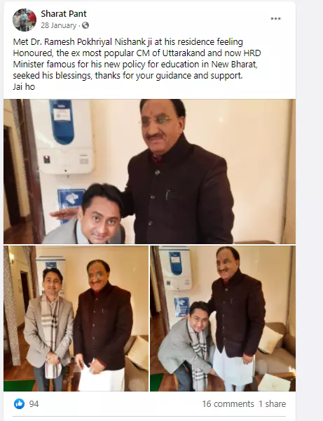ത്രിവേന്ദ്ര സിങ് റാവത്ത് മുഖ്യമന്ത്രിയായിരിക്കെയായിരുന്നു ടെൻഡർ ക്ഷണിച്ചിരുന്നത്. ഈ സമയത്ത് ത്രിവേന്ദ്രയുമായുള്ള കൂടിക്കാഴ്ചയുടെ ചിത്രങ്ങൾ പന്ത് ഫേസ്ബുക്കിൽ പങ്കുവച്ചിരുന്നു. എന്നാൽ, ത്രിവേന്ദ്ര രാജിവച്ച് പുതിയ മുഖ്യമന്ത്രിയായി തിരാത്ത് സിങ് റാവത്ത് അധികാരമേറ്റതിനു പിറകെ അദ്ദേഹത്തെ അഭിനന്ദിച്ചും സമൂഹമാധ്യമങ്ങളിൽ പന്ത് കുറിപ്പിട്ടു. പിന്നീട് നേരിൽ കൂടിക്കാഴ്ച നടത്തുകയും ചെയ്തു.