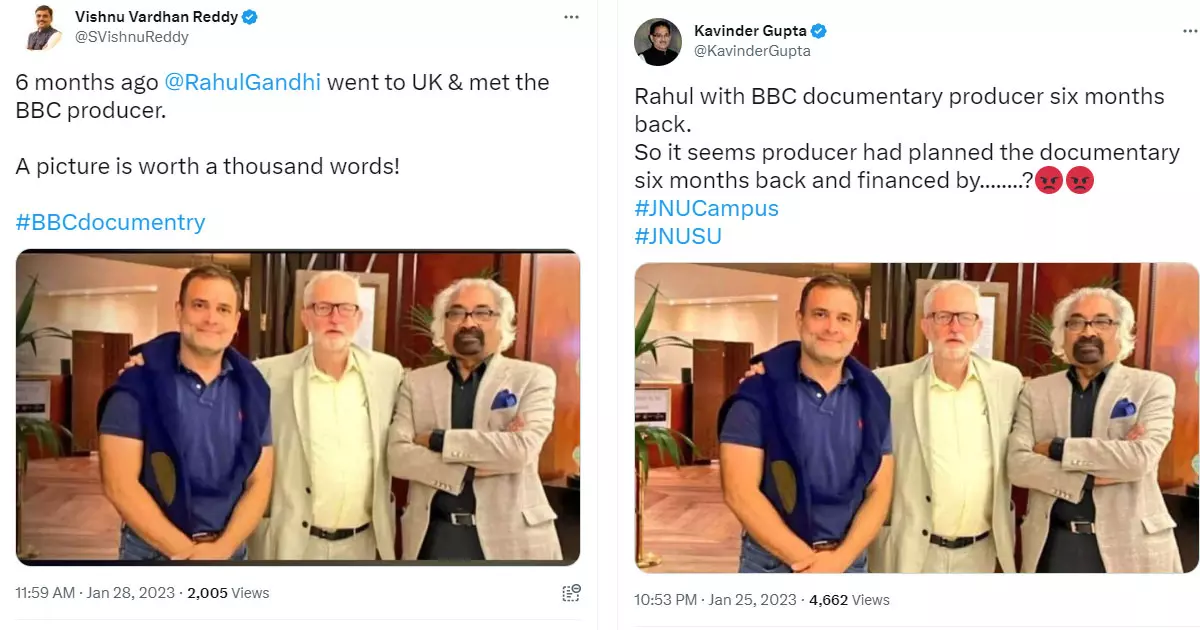 'ആറു മാസം മുമ്പ് രാഹുൽ ഗാന്ധി യു.കെയിൽ പോയി. ബി.ബി.സി പ്രൊഡ്യൂസറെ കണ്ടു. ഒരു ചിത്രം ആയിരം വാക്കുകളേക്കാൾ മൂല്യമുള്ളത്' വിഷ്ണു വർധൻ റെഡ്ഡി ചിത്രം പങ്കുവെച്ച് കുറിച്ചു. വെരിഫൈഡ് അക്കൗണ്ടുകളിലാണ് ബിജെപിയുടെ ഉന്നത നേതാക്കൾ ഈ വ്യാജ വിവരം പോസ്റ്റ് ചെയ്തത്. ഇതുവരെ അവ നീക്കം ചെയ്തിട്ടില്ല. ഇതുപോലെ നിരവധി പേർ ഈ വ്യാജ വിവരം പോസ്റ്റ് ചെയ്തിട്ടുണ്ട്. ഇക്കാര്യം ഫാക്ട് ചെക്കിംഗ് വെബ്സൈറ്റായ ആൾട്ട് ന്യൂസ് തുറന്നുകാട്ടി. 2022 മേയിൽ രാഹുൽ ഗാന്ധി നടത്തിയ ലണ്ടൻ യാത്രയിൽ നിന്നുള്ളതാണ് ഈ ചിത്രമെന്ന് വെബ്സൈറ്റിൽ വ്യക്തമാക്കി. ലേബർ പാർട്ടി എംപിയായ ജെറേമി കൊർബിനും മൻമോഹൻ സിംഗ് പ്രധാനമന്ത്രിയായിരിക്കെ ഉപദേശകനായിരുന്ന കോൺഗ്രസ് സഹയാത്രികൻ സാം പിത്രോധയുമാണ് കൂടെയുണ്ടായിരുന്നതെന്നും വ്യക്തമാക്കി.