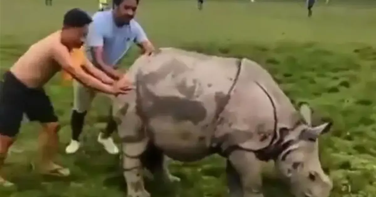 ഫുട്ബോൾ ഗ്രൗണ്ടിൽ കാണ്ടാമൃഗം കയറി; രണ്ടാൾ തള്ളിയിട്ടും പുറത്തുപോയില്ല, വീഡിയോ