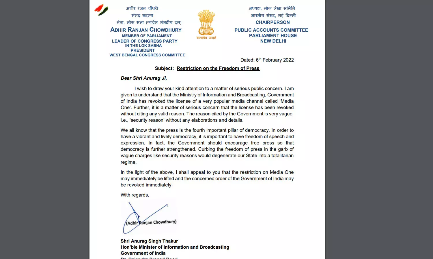 മീഡിയവണിന്റെ വിലക്ക് നീക്കണം; മന്ത്രിക്ക് അധീർ രഞ്ജൻ ചൗധരിയുടെ കത്ത്