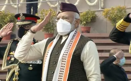 സ്വാതന്ത്ര്യ ദിനമായാലും റിപ്പബ്ലിക് ദിനമായാലും വേഷവിധാനത്തിൽ എന്തെങ്കിലും പുതുമ കൊണ്ടുവരാൻ പ്രധാമന്ത്രി നരേന്ദ്രമോദി ശ്രമിക്കാറുണ്ട്. ഇത്തവണത്തെ റിപ്പബ്ലിക് പരേഡ് ദിനത്തിലും ആ പതിവ് തെറ്റിച്ചില്ല. ഉത്തരാഖണ്ഡിലെ പരമ്പരാഗത തൊപ്പിയും മണിപ്പൂരിലെ ഷാളും ധരിച്ചാണ് ഇന്ന് മോദി എത്തിയത്. ഉത്തരാഖണ്ഡിന്റെ ദേശീയ പുഷ്പമായ ബ്രഹ്മ കമലവും തൊപ്പിയിൽ ആലേഖനം ചെയ്തിട്ടുണ്ട്. സാധാരണ റിപ്പബ്ലിക് ദിന പരേഡിൽ അദ്ദേഹം തലപ്പാവാണ് ധരിക്കാറ്. എന്നാൽ ഇത്തവണ ആ പതിവ് തെറ്റിച്ചാണ് ഉത്തരാഖണ്ഡിലെ തൊപ്പി ധരിച്ചത്.