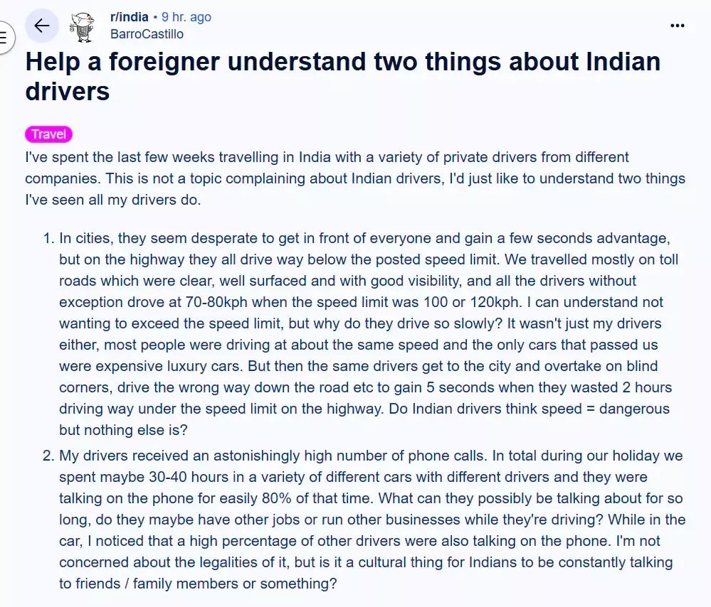 'എപ്പോഴും ഫോണിൽ, എന്താണിത്ര സംസാരിക്കുന്നത്?'; ചര്ച്ചയായി ഇന്ത്യൻ ഡ്രൈവര്മാരെക്കുറിച്ചുള്ള വിദേശ സഞ്ചാരിയുടെ പോസ്റ്റ്