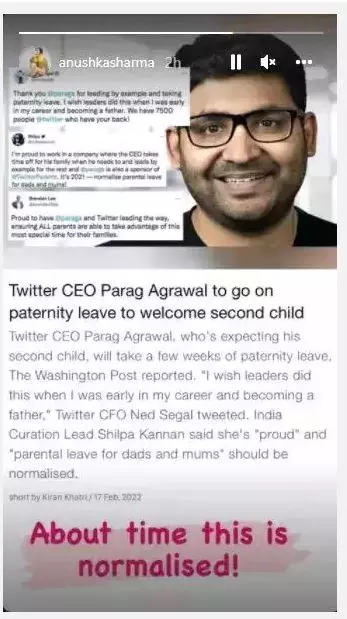 ഇതൊരു സാധാരണ സംഭവമായി മാറിത്തുടങ്ങി; പറ്റേണിറ്റി അവധിയെടുക്കുന്ന ട്വിറ്റർ സി.ഇ.ഒ പരാഗ് അഗർവാളിന് അഭിനന്ദനവുമായി അനുഷ്ക ശർമ