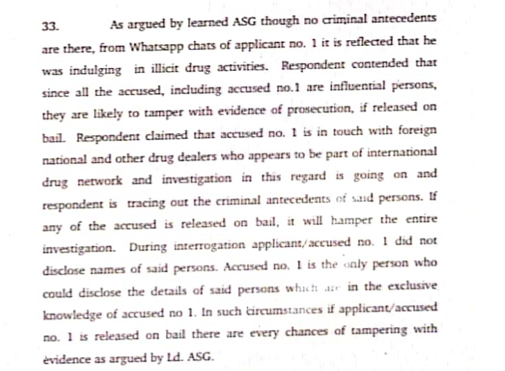 - പ്രതിക്ക് ക്രിമിനൽ പശ്ചാത്തലമില്ലെങ്കിലും നിയമപരമല്ലാത്ത ലഹരി പ്രവർത്തനങ്ങളിൽ പ്രതി (ആര്യൻഖാൻ) ഉൾപ്പെട്ടിട്ടുണ്ടെന്ന് വാട്സ് ആപ്പ് ചാറ്റുകൾ തെളിയിക്കുന്നു. ആരോപണ വിധേയരെല്ലാം ഏറെ സ്വാധീനമുള്ള വ്യക്തികളാണ്. അതുകൊണ്ടു തന്നെ ഇവർ പുറത്തിറങ്ങിയാൽ തെളിവു നശിപ്പിക്കാൻ സാധ്യതയുണ്ട്.