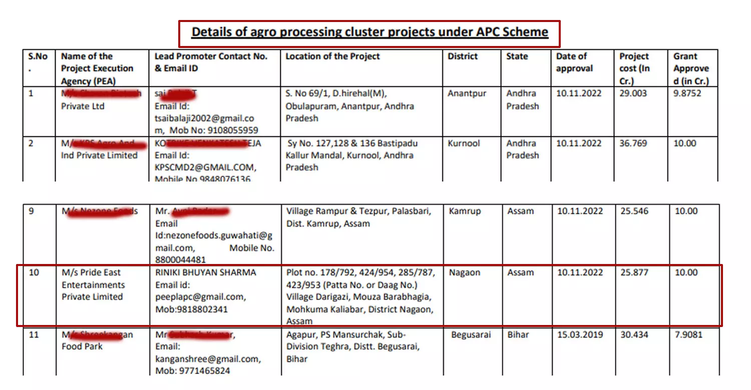മാസങ്ങൾക്കുള്ളിൽ കൃഷിഭൂമി വ്യാവസായിക ഭൂമിയാക്കി മാറ്റിയെന്നും ഭക്ഷ്യ സംസ്കരണ യൂണിറ്റ് സ്ഥാപിക്കാൻ 'പ്രൈഡ് ഈസ്റ്റ് എന്റർടൈൻമെന്റ്' പ്രധാനമന്ത്രി കിസാൻ സമ്പദ് യോജനയ്ക്ക് കീഴിൽ സബ്സിഡിക്ക് അപേക്ഷിച്ചെന്നും അതനുസരിച്ച് കേന്ദ്ര ഭക്ഷ്യ സംസ്കരണ മന്ത്രാലയം കഴിഞ്ഞ വർഷം നവംബർ 10ന് 10 കോടി രൂപ അനുവദിച്ചെന്നും റിപ്പോർട്ടിൽ പറയുന്നു. ഗൊഗോയ് പങ്കുവച്ച പട്ടികയിൽ 10ാമതായാണ് ശർമയുടെ ഭാര്യയുടെ കമ്പനിയുടെ പേരുള്ളത്.