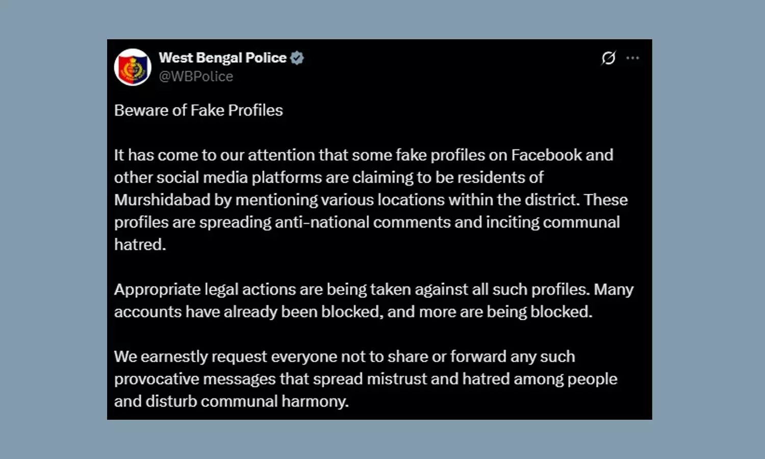 |മുർഷിദാബാദ് സ്വദേശികളാണെന്ന് അവകാശപ്പെടുന്ന ഇത്തരം വ്യാജ പ്രൊഫൈലുകൾ, ദേശവിരുദ്ധവും സാമുദായിക സ്പർധ സൃഷ്ടിക്കുന്നതുമായ പ്രചാരണങ്ങൾ നടത്തുകയാണെന്നും പൊലീസ് ചൂണ്ടിക്കാട്ടി.