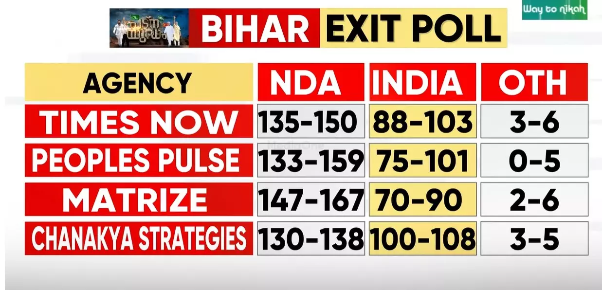 ബിഹാറിൽ ബിജെപി–ജെഡിയു നേതൃത്വത്തിൽ എൻഡിഎ സഖ്യം അധികാരത്തിൽ തുടരുമെന്നും 130 ലേറെ സീറ്റുകൾ നേടുമെന്നുമാണ് പല എക്സിറ്റ് പോൾ സർവെകളും പ്രവവചിക്കുന്നത്. 243 അംഗ നിയമസഭയിൽ ഭൂരിപക്ഷത്തിന് വേണ്ടത് 122 സീറ്റുകളാണ്.