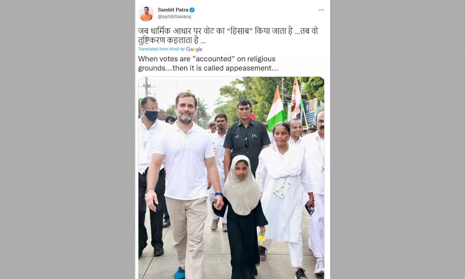 മതപരമായ അടിസ്ഥാനത്തിൽ വോട്ടുകൾ കണക്ക് കൂട്ടുമ്പോൾ അതിനെ പ്രീണനമെന്ന് വിളിക്കുന്നു-സാംബിത് പത്ര ട്വീറ്റ് ചെയ്തു.