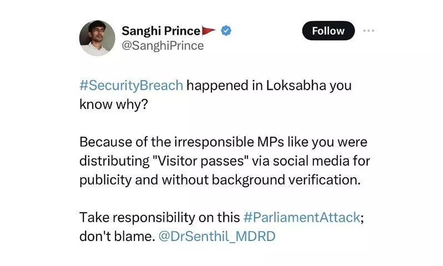 എന്നാൽ, കർണാടകയിലെ മൈസൂരുവിൽ നിന്നുള്ള ബിജെപി എം.പി പ്രതാപ് സിംഹയാണ് അക്രമികൾക്ക് ലോക്സഭാ സന്ദർശക പാസ് നൽകിയതെന്ന് പിന്നീട് തെളിഞ്ഞതോടെ പ്രവീൺ രാജ് ട്വീറ്റ് ഡിലീറ്റ് ചെയ്യുകയായിരുന്നു. എന്നാൽ അതിനോടകം ഈ ട്വീറ്റ് വ്യാപകമായി ഷെയർ ചെയ്യപ്പെട്ടിരുന്നു.