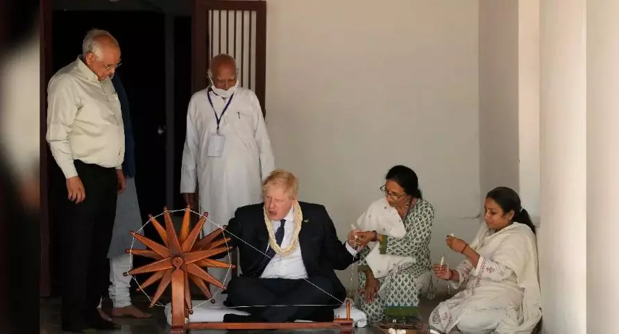 തുടർന്ന് മുഖ്യമന്ത്രി ഭൂപേന്ദ്ര പട്ടേലിനൊപ്പം റോഡ്ഷോയായാണ് താമസസൗകര്യം ഒരുക്കിയ ആശ്രമം റോഡിലെ പഞ്ചനക്ഷത്ര ഹോട്ടലിലെത്തിയത്. ഇവിടെനിന്ന് പട്ടേലിനൊപ്പം സബർമതി ആശ്രമത്തിലെത്തി. ആശ്രമിത്തിൽ മഹാത്മാ ഗാന്ധിയുടെ പ്രതിമയിൽ ബ്രിട്ടീഷ് പ്രധാനമന്ത്രി പുഷ്പാർച്ചന നടത്തി. ആശ്രമത്തിലുള്ള ചർക്കയിൽ അദ്ദേഹം നൂൽനൂറ്റു. മഹാത്മാ ഗാന്ധി ജീവിതകാലത്ത് കഴിഞ്ഞിരുന്ന ഹൃദയകുഞ്ചും ഗാന്ധിയുടെ ബ്രിട്ടീഷ് ശിഷ്യയായിരുന്ന മീരാബെൻ താമസിച്ചിരുന്ന മീരാ കുടീരും സന്ദർശിച്ചു. ആശ്രമത്തിന്റെ സമ്മാനമായി ചർക്കയുടെ മാതൃകയും മഹാത്മാ ഗാന്ധിയുടെ അപ്രകാശിത കൃതിയായ Guide to Londonഉം, മീരാബെന്നിന്റെ ആത്മകഥ The Spirit's Pilgrimageഉം ഭൂപേന്ദ്ര പട്ടേൽ ജോൺസന് കൈമാറി.