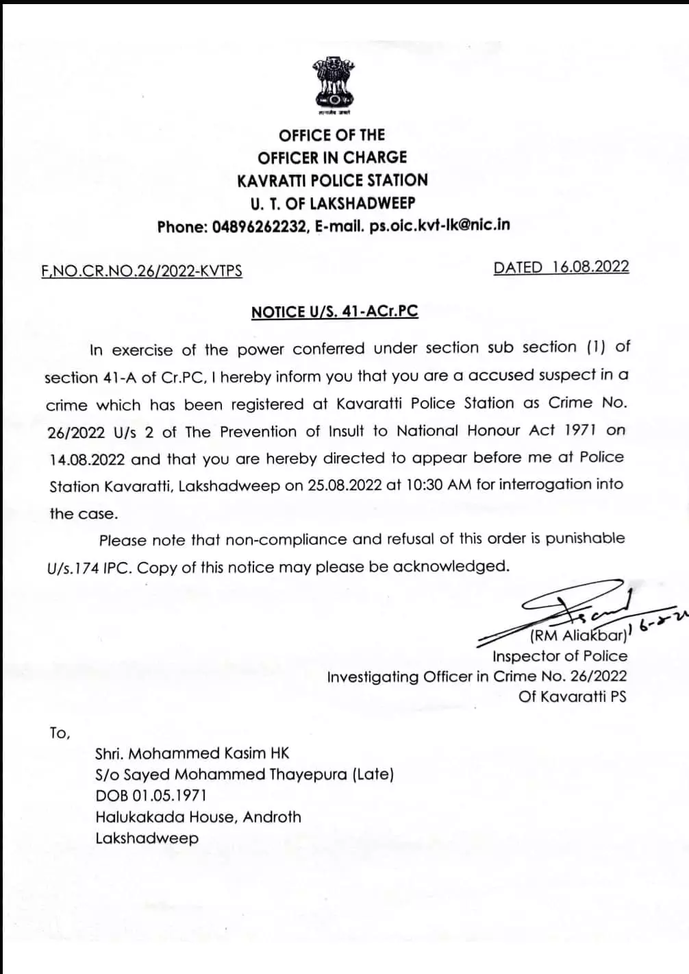 കവരത്തി പൊലീസാണ് കേസെടുത്തത്.