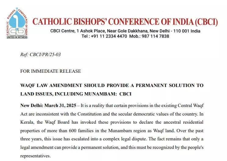 വഖഫ് നിയമഭേദഗതി ബില്ലിനെ അനുകൂലിച്ച് സിബിസിഐ