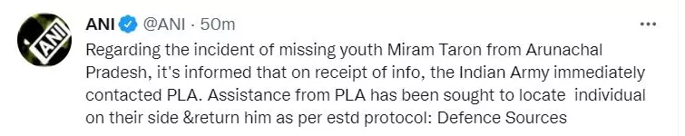 അരുണാചൽ പ്രദേശിലെ ലുങ്ത ജോർ മേഖലയിലെ ഒരു ഗ്രാമത്തിൽ നിന്ന് 17-കാരനെ ചൈനീസ് സൈന്യം തട്ടിക്കൊണ്ടുപോയി. ചൊവ്വാഴ്ച ഇവിടെ നിന്ന് കാണാതായ മിറാം തരൊൺ എന്ന കൗമാരക്കാരനെ ചൈനീസ് സൈന്യം കൊണ്ടുപോയതാണെന്ന് ബി.ജെ.പി എം.പി തപിർ ഗാവോ ആണ് ആദ്യം ആരോപിച്ചത്. ഇന്ത്യൻ സൈന്യം ഇക്കാര്യം സ്ഥിരീകരിച്ചുവെന്നും ഇയാളെ വിട്ടുനൽകാൻ ഔദ്യോഗിക മാർഗങ്ങളിലൂടെ ചൈനീസ് സൈന്യത്തോട് ആവശ്യപ്പെട്ടുവെന്നും പ്രതിരോധ വൃത്തങ്ങളെ ഉദ്ധറിച്ച് വാർത്താ ഏജൻസിയായ എ.എൻ.ഐ റിപ്പോർട്ട് ചെയ്തു.